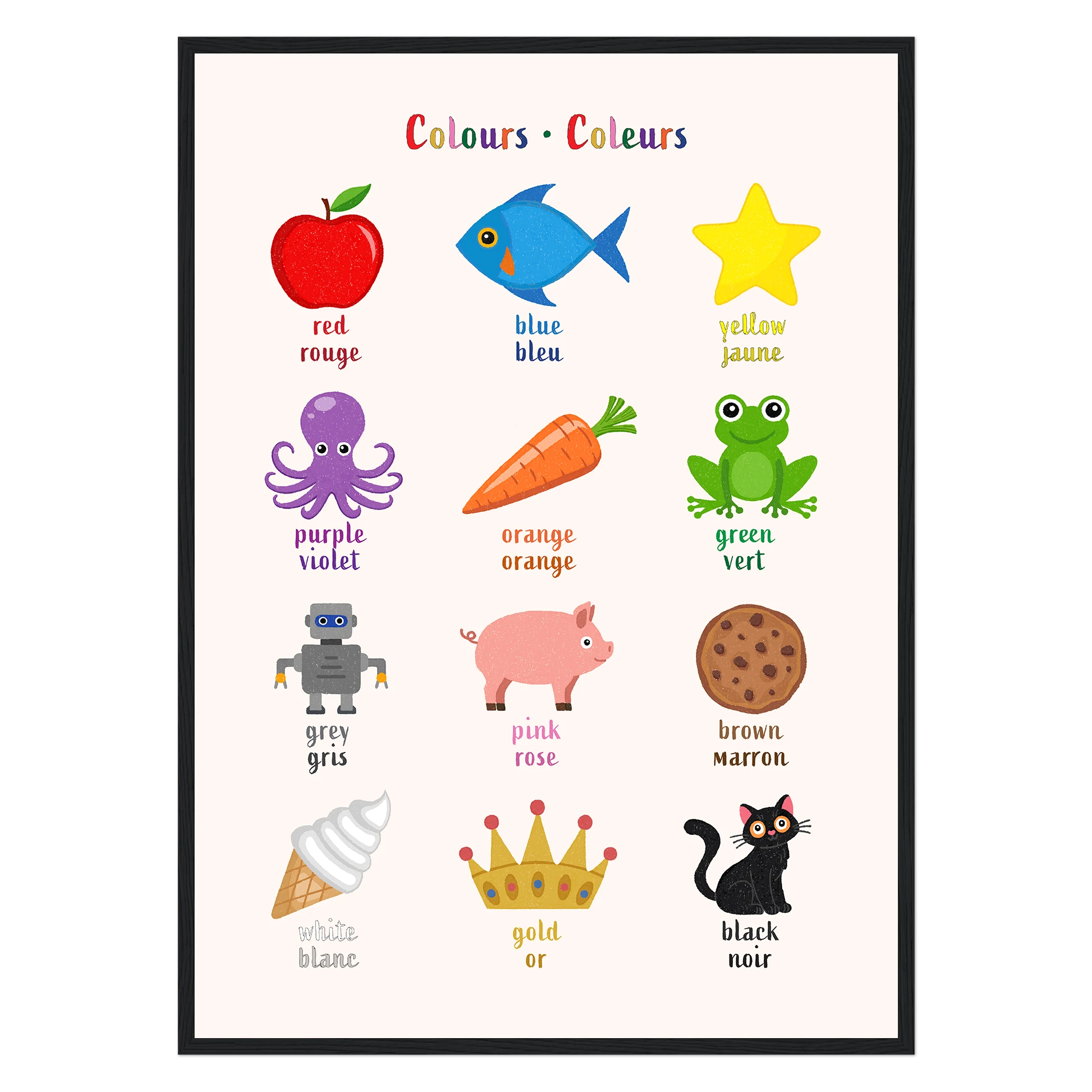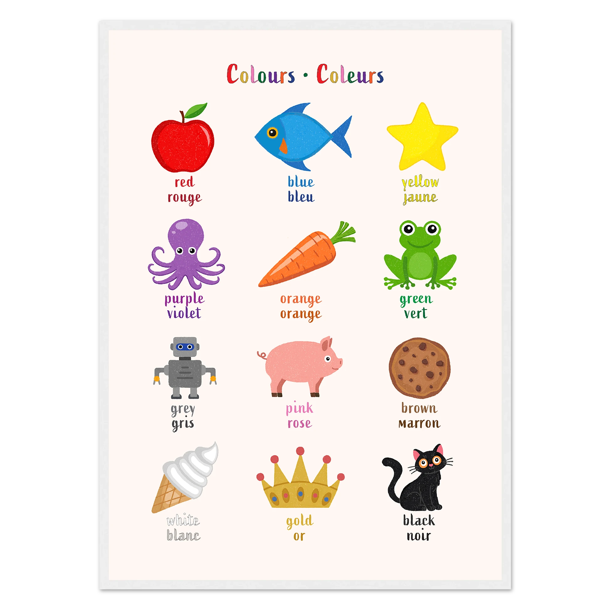 Encourage bilingual learning with this beautifully illustrated poster of colours for kids. Designed to support early language learning, each object is a specific colour labeled with its name in both English and French — making it easy and fun for toddlers and children (and parents!) to learn new vocabulary together.