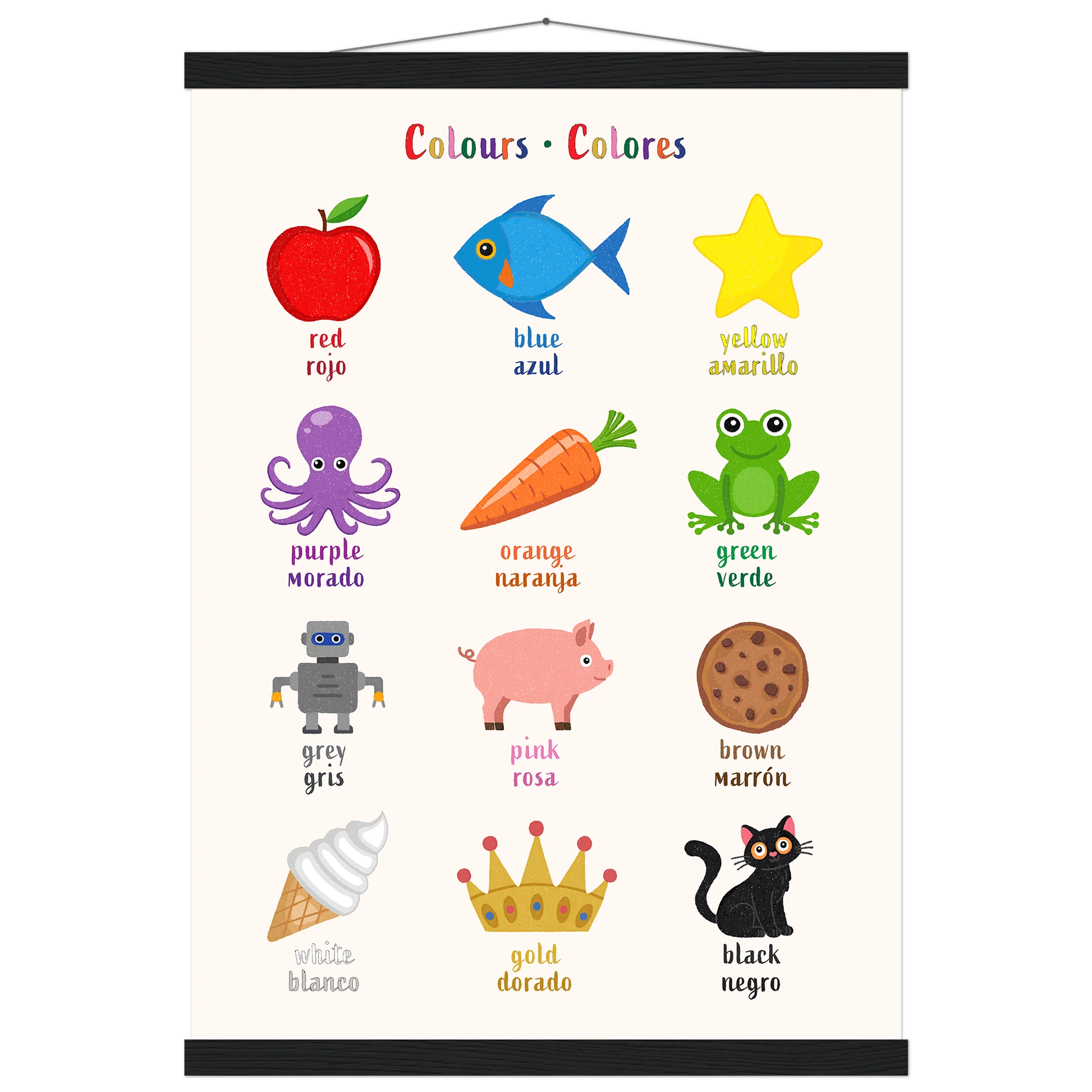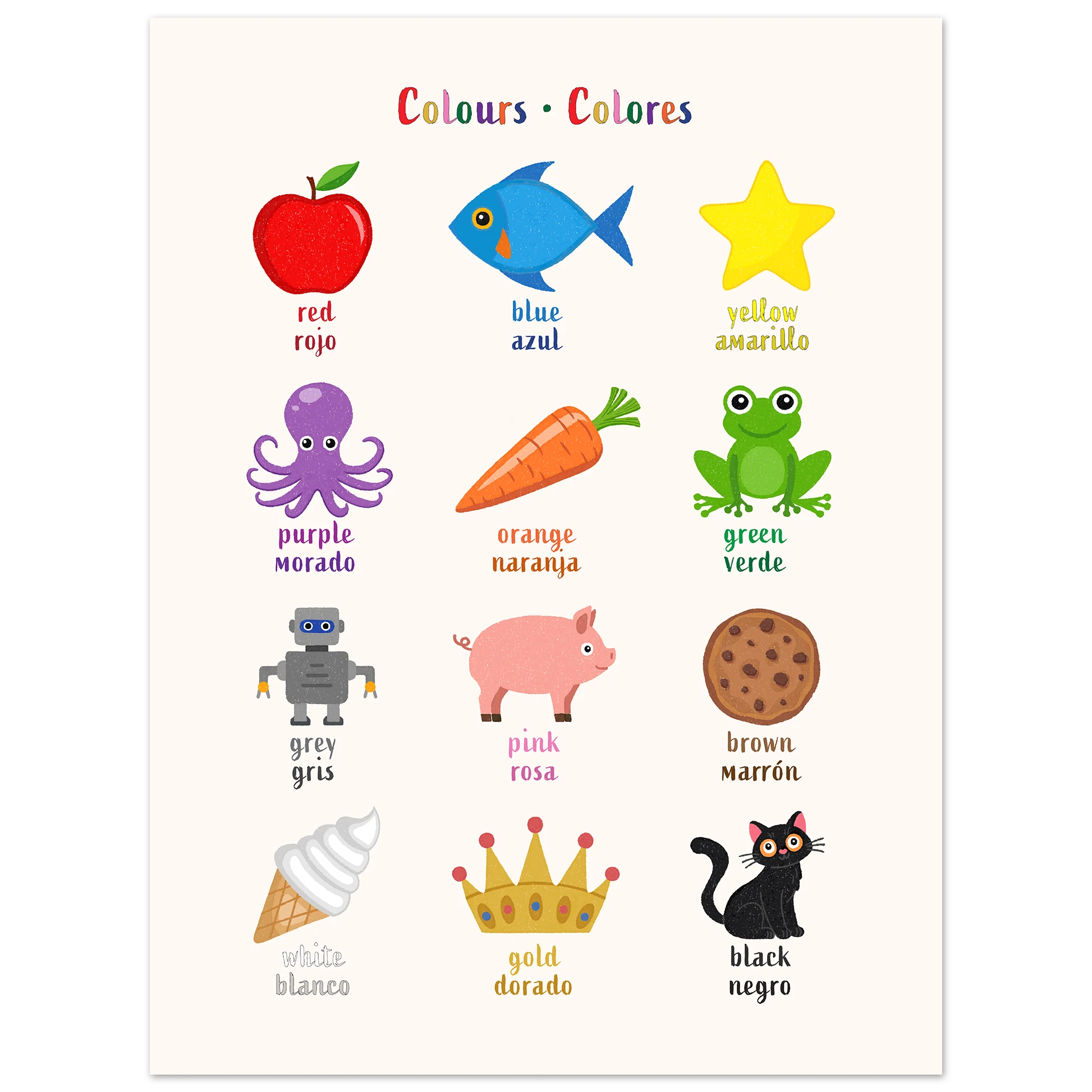 Encourage bilingual learning with this beautifully illustrated poster of colours for kids. Designed to support early language learning, each object is a specific colour labeled with its name in both English and Spanish — making it easy and fun for toddlers and children (and parents!) to learn new vocabulary together.