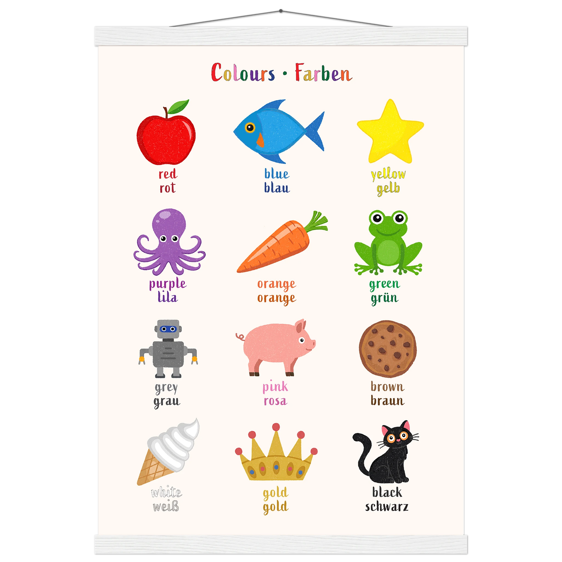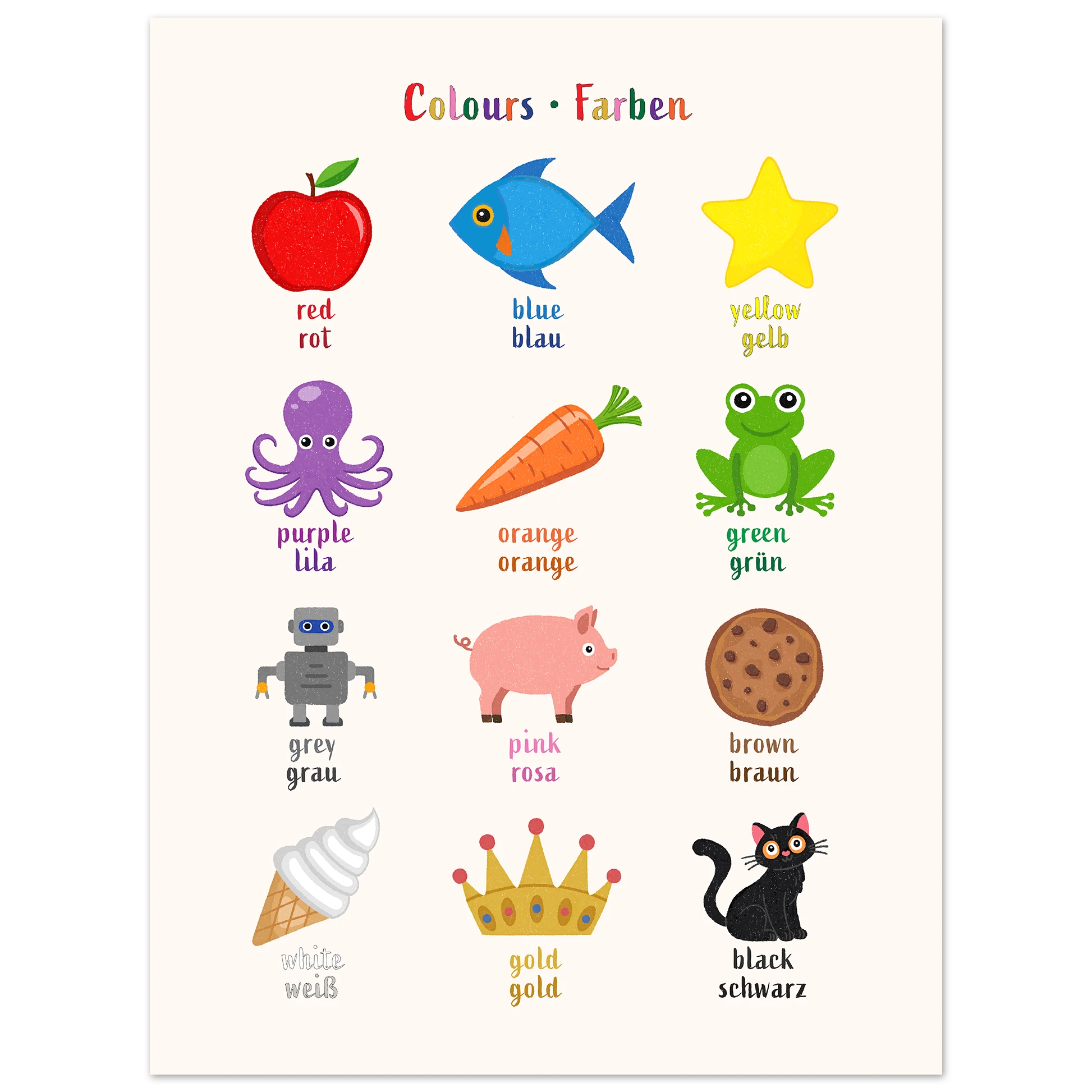 Encourage bilingual learning with this beautifully illustrated poster of colours for kids. Designed to support early language learning, each object is a specific colour labeled with its name in both English and German — making it easy and fun for toddlers and children (and parents!) to learn new vocabulary together.