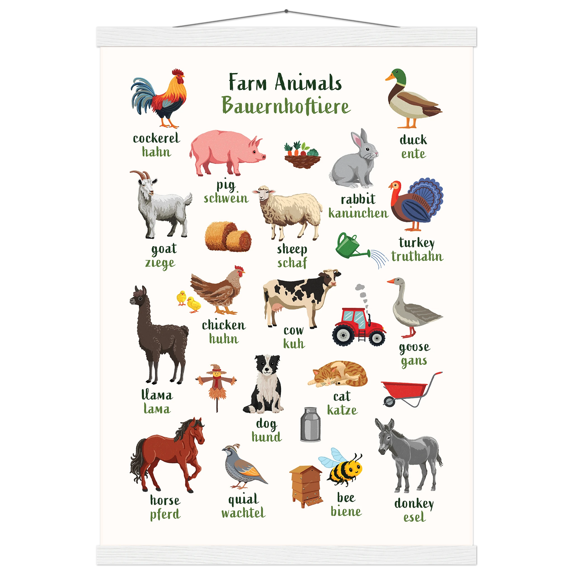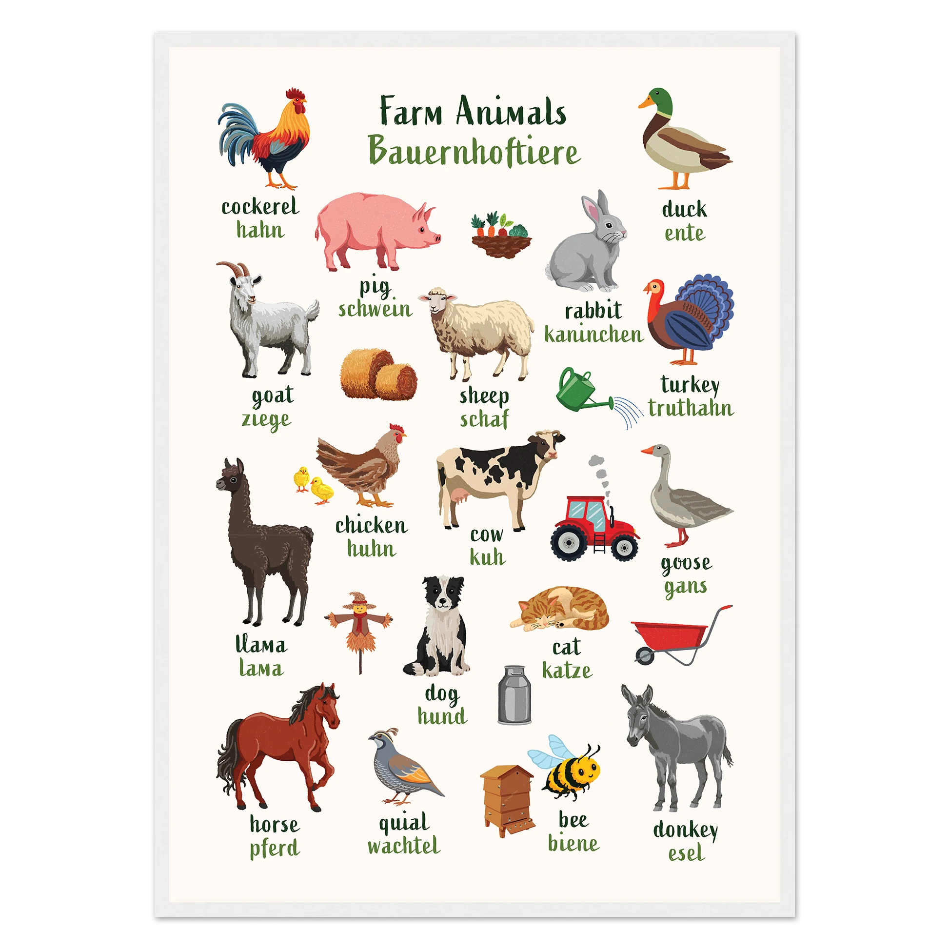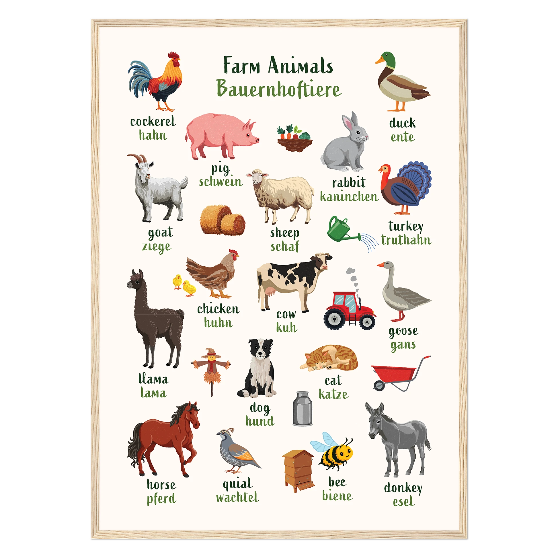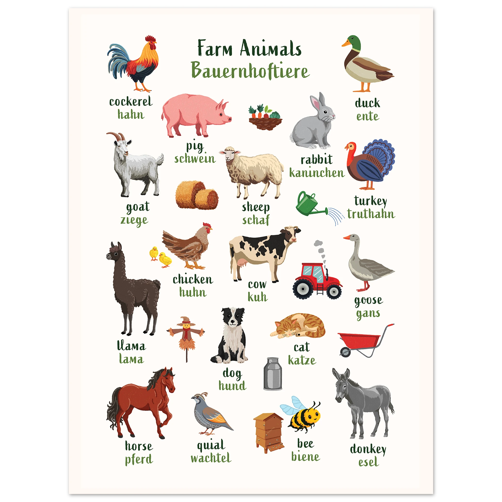 Encourage bilingual learning with this beautifully illustrated farmyard poster for kids. Designed to support early language learning, each piece of fruit is labeled with its name in both English and German — making it easy and fun for toddlers and children (and parents!) to learn new vocabulary together.