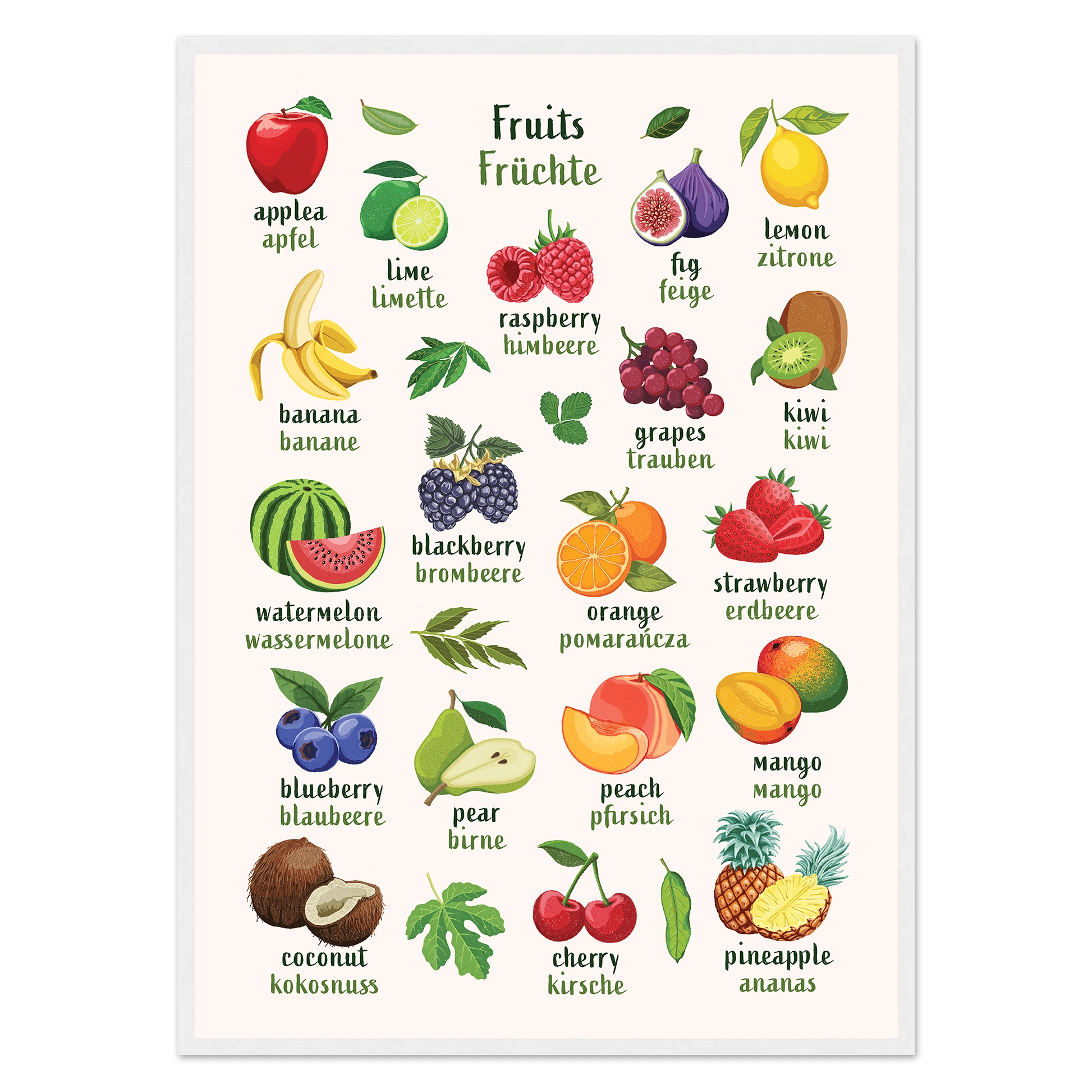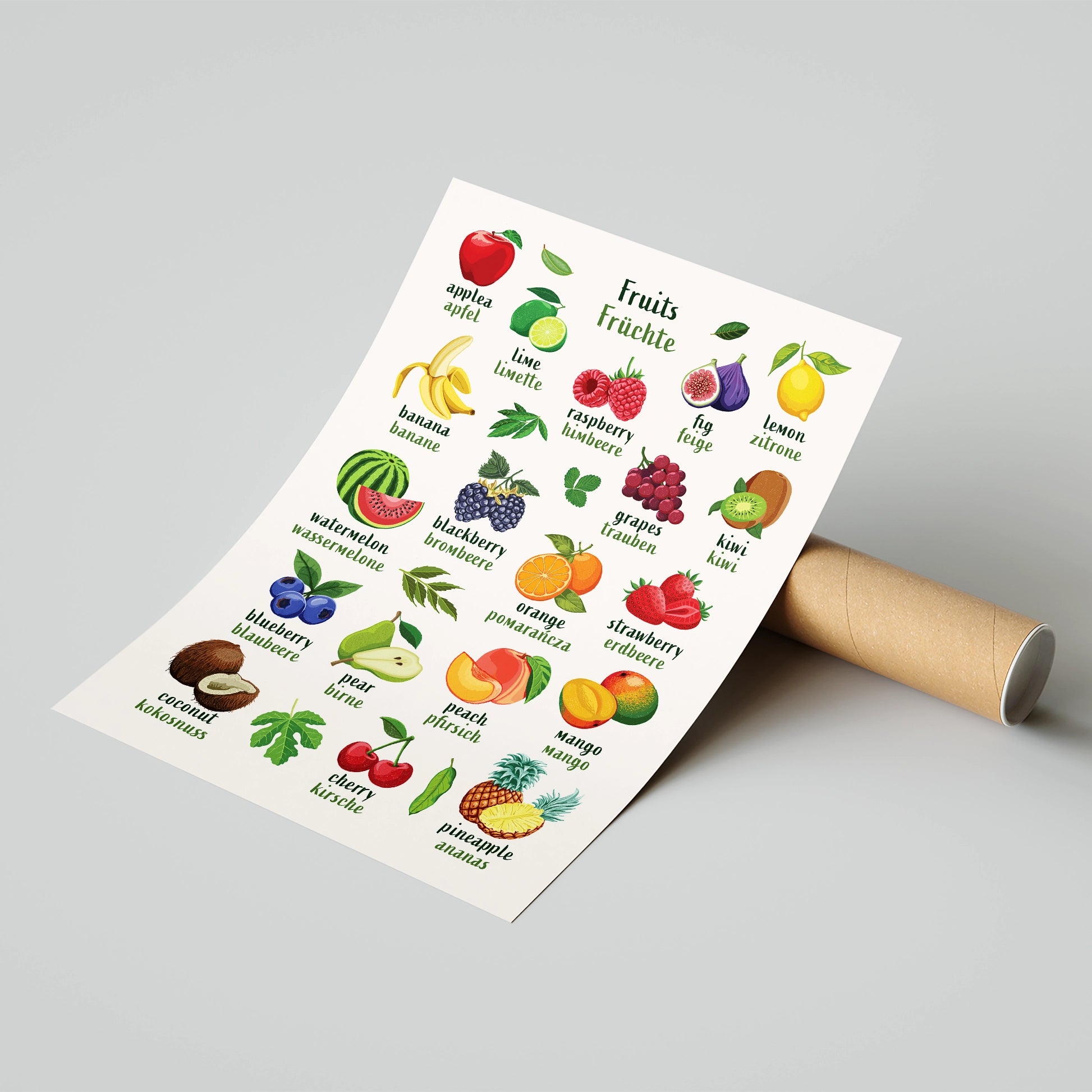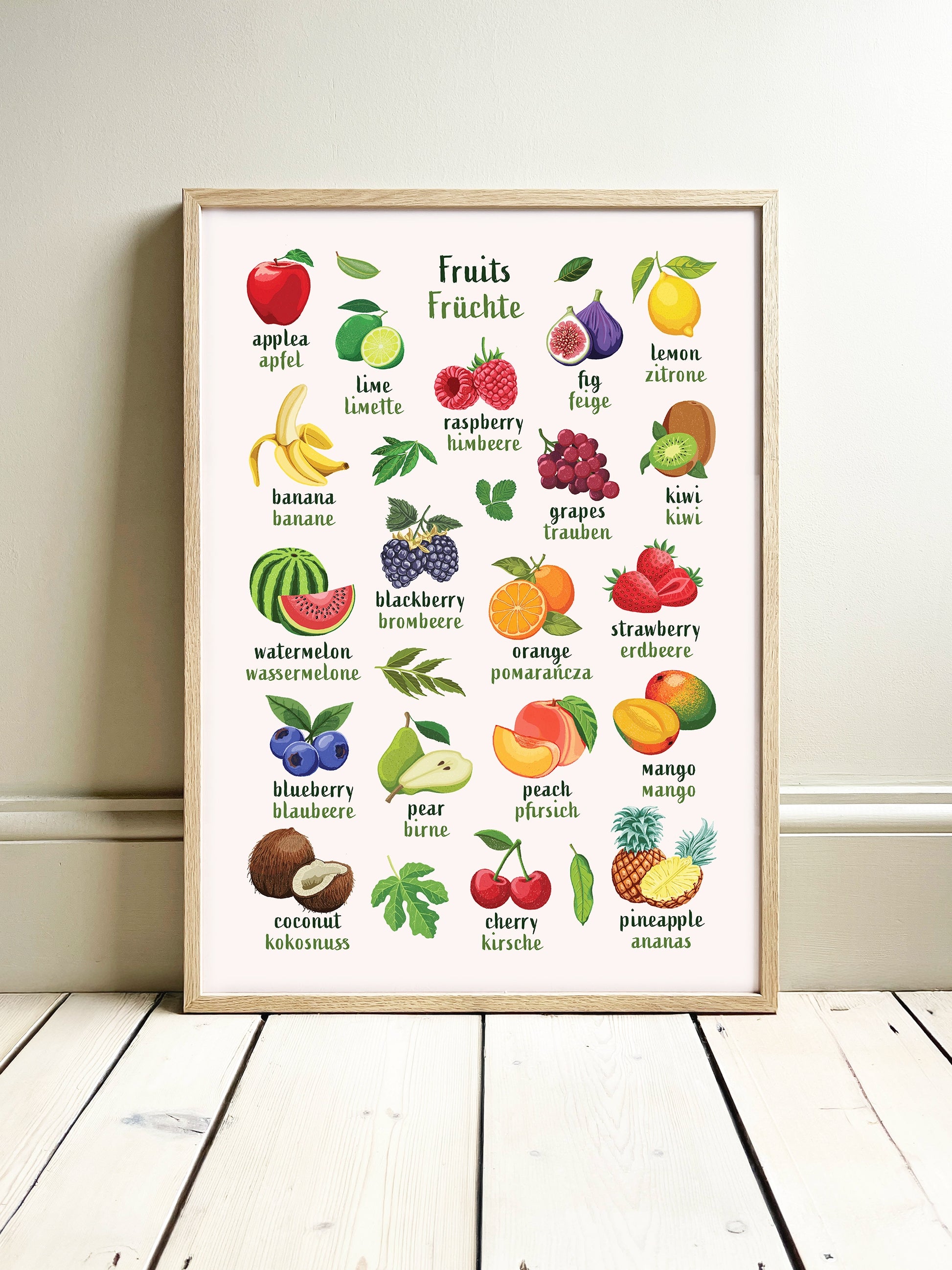 Encourage bilingual learning with this beautifully illustrated fruit poster for kids. Designed to support early language learning, each piece of fruit is labeled with its name in both English and German — making it easy and fun for toddlers and children (and parents!) to learn new vocabulary together.