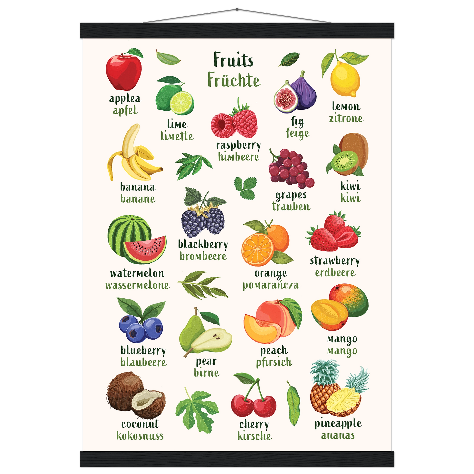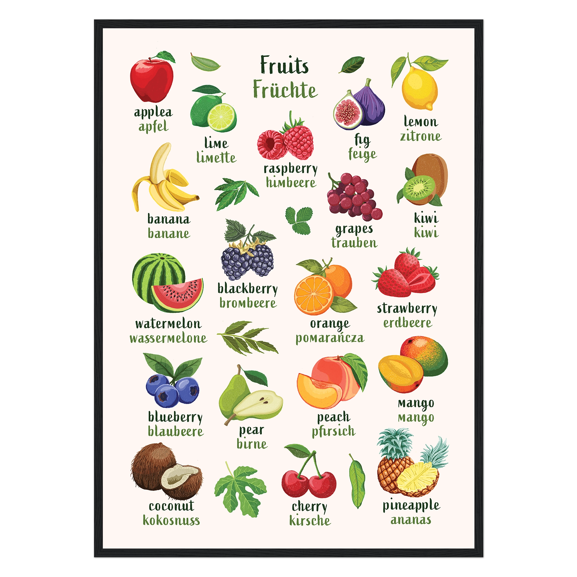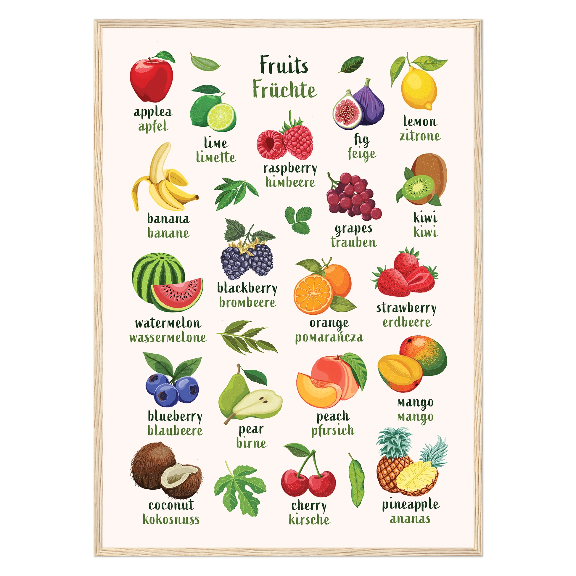 Encourage bilingual learning with this beautifully illustrated fruit poster for kids. Designed to support early language learning, each piece of fruit is labeled with its name in both English and German — making it easy and fun for toddlers and children (and parents!) to learn new vocabulary together.