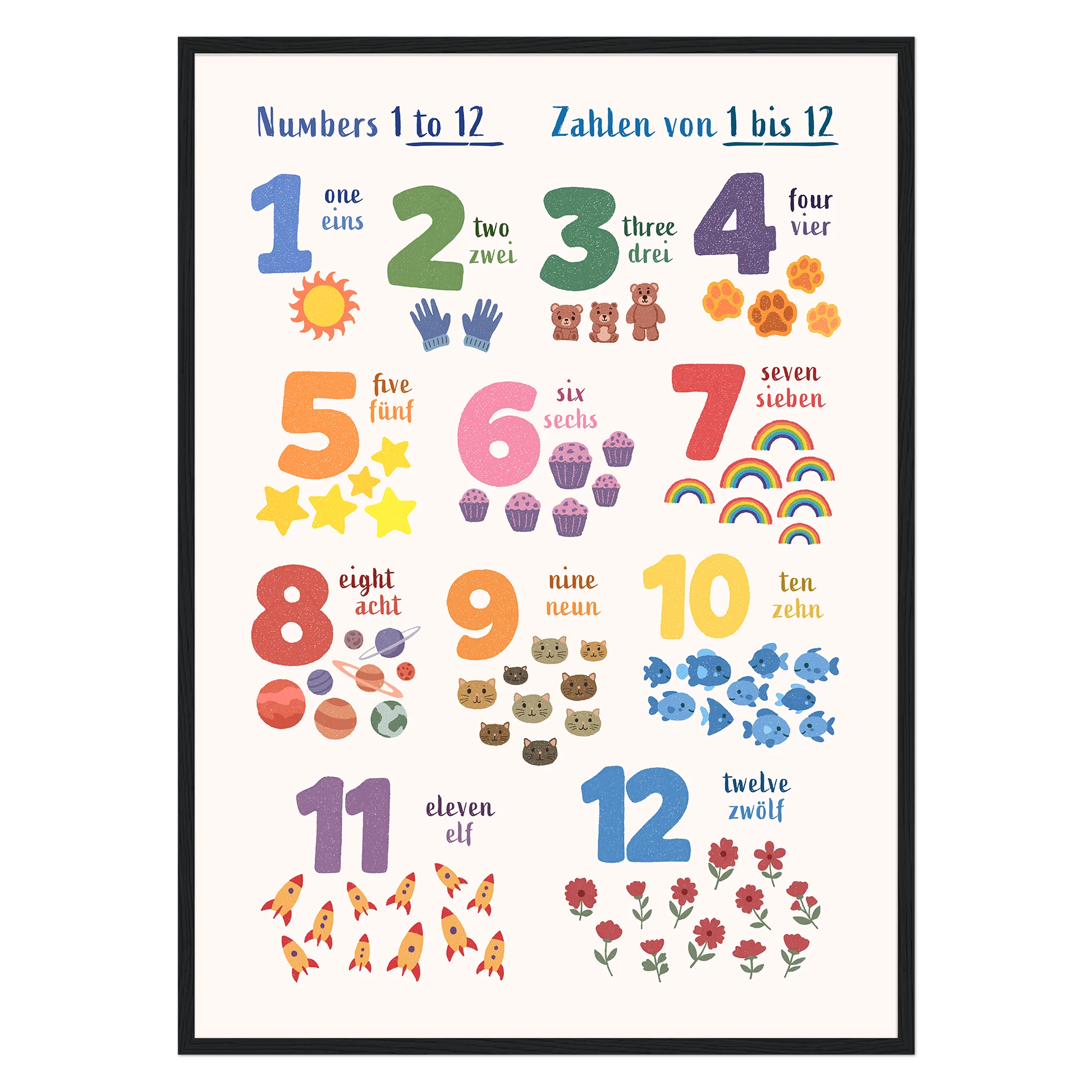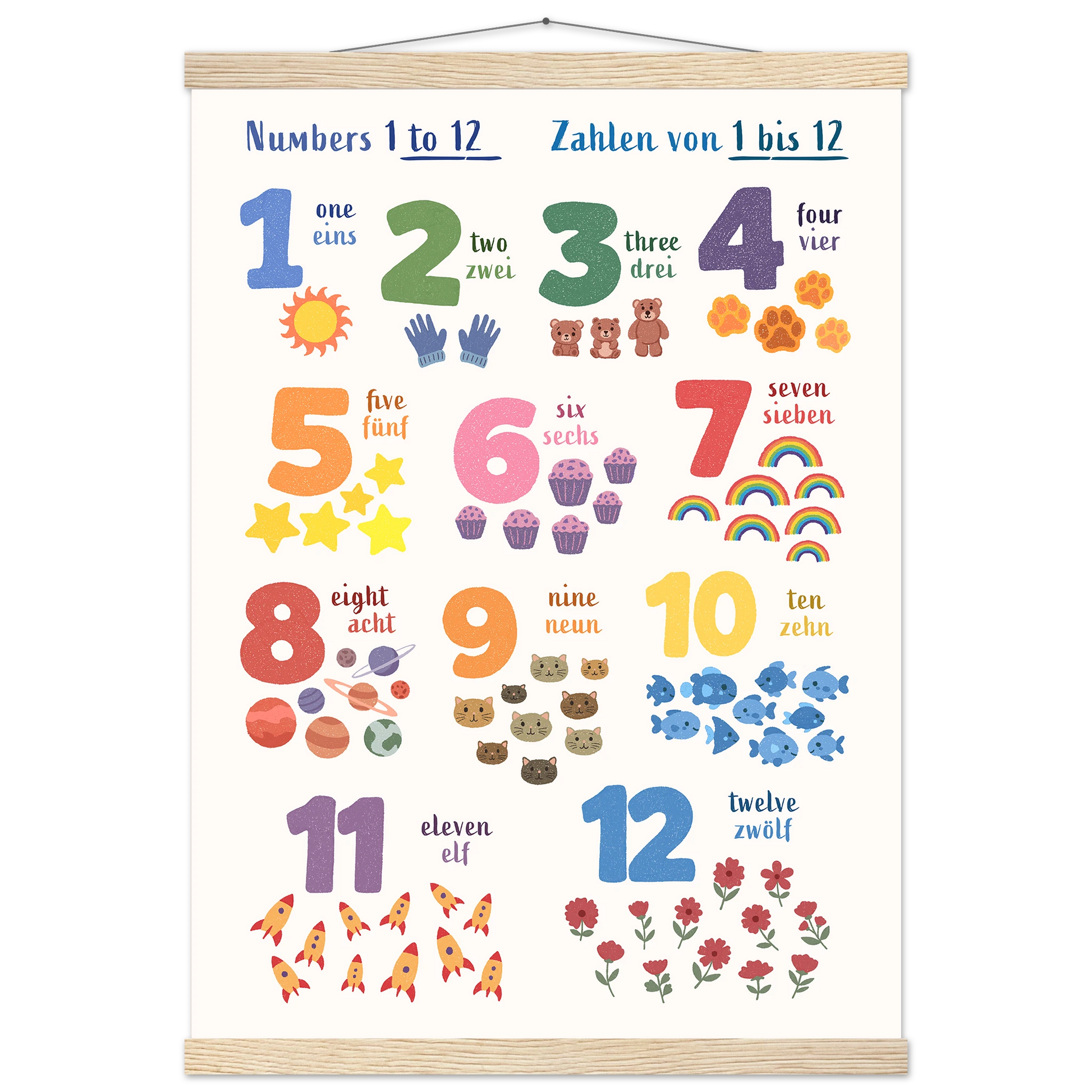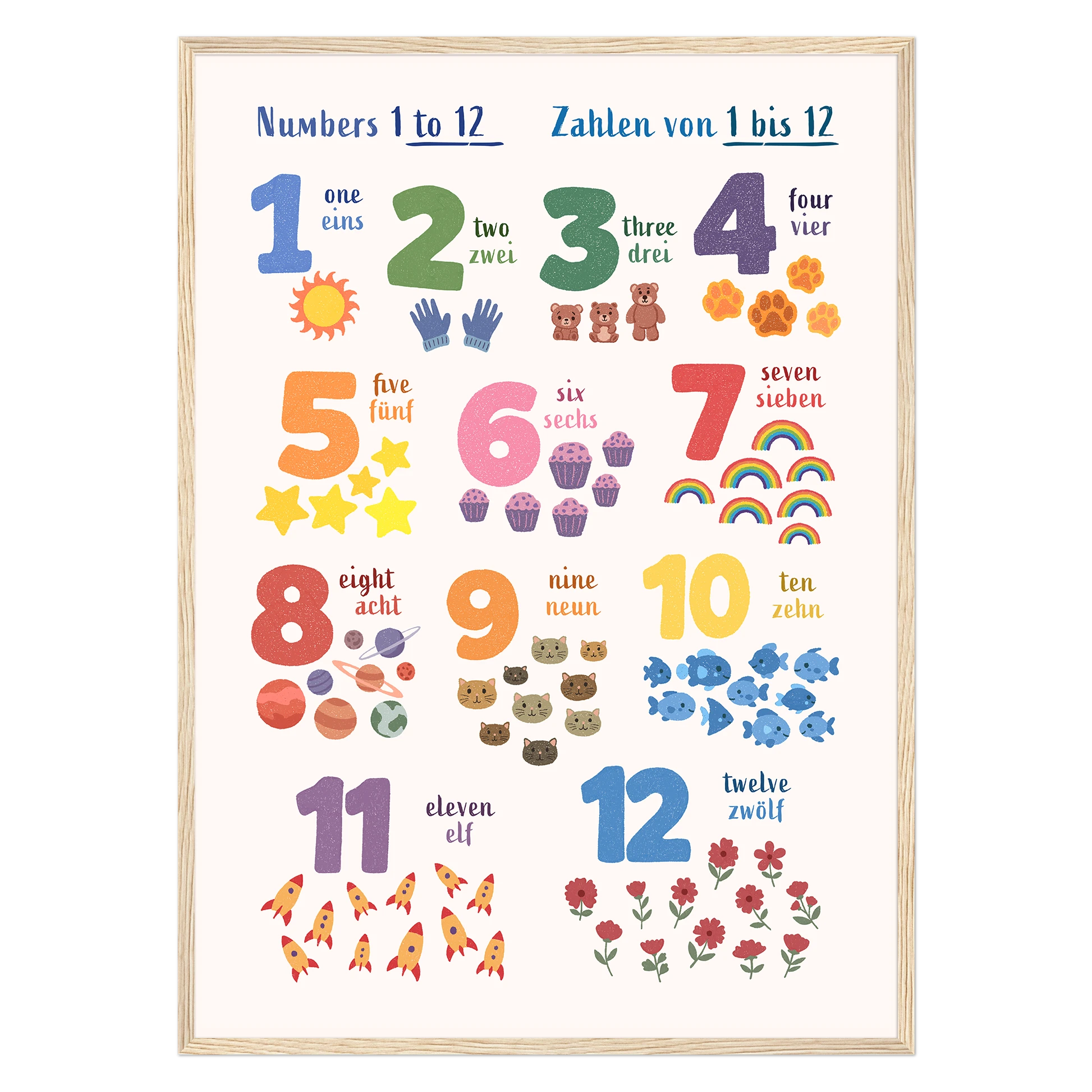 Encourage bilingual learning with this beautifully illustrated poster of numbers for kids. Designed to support early language learning, each number alongside matching illustrations is paired with its name in both English and German — making it easy and fun for toddlers and children (and parents!) to learn new vocabulary together.