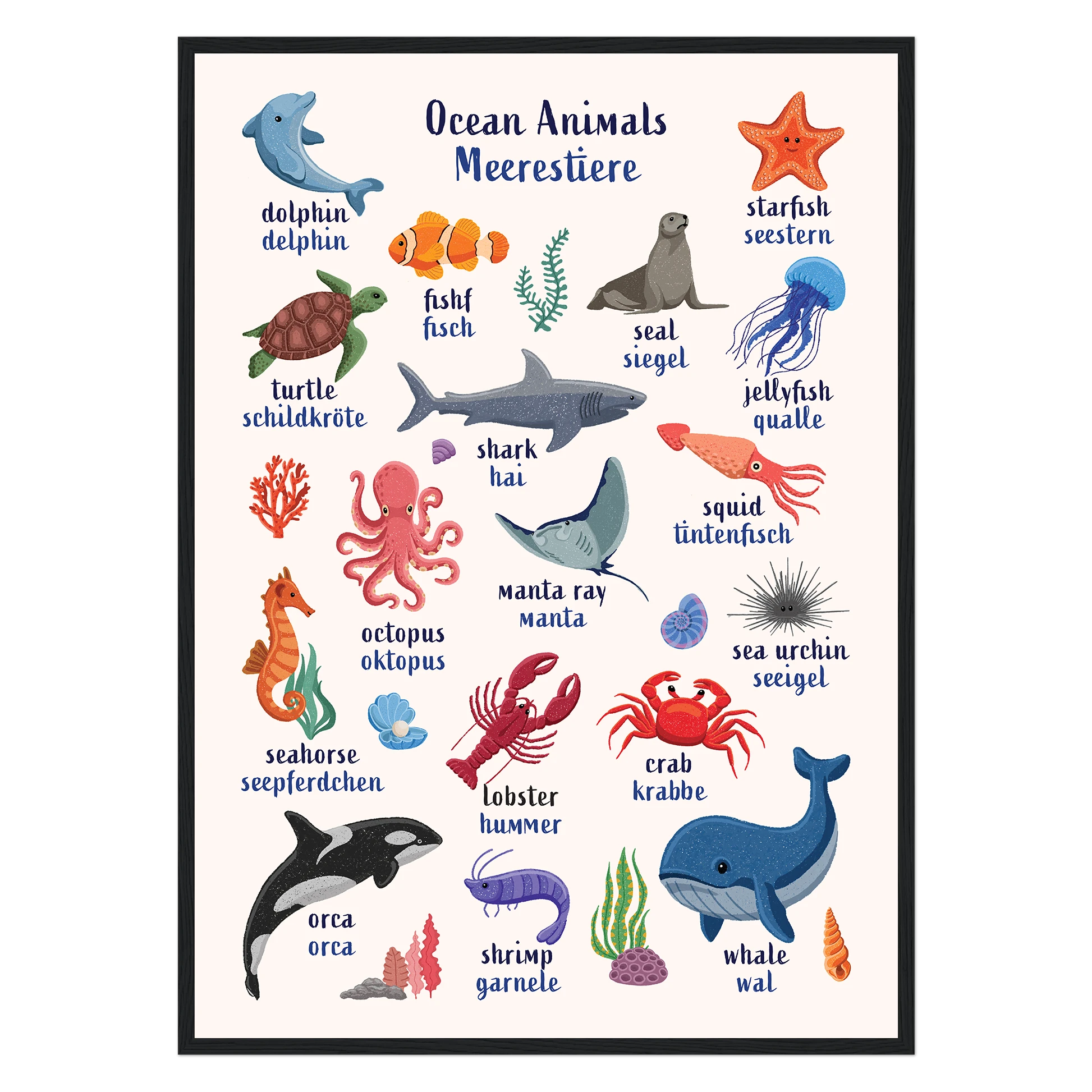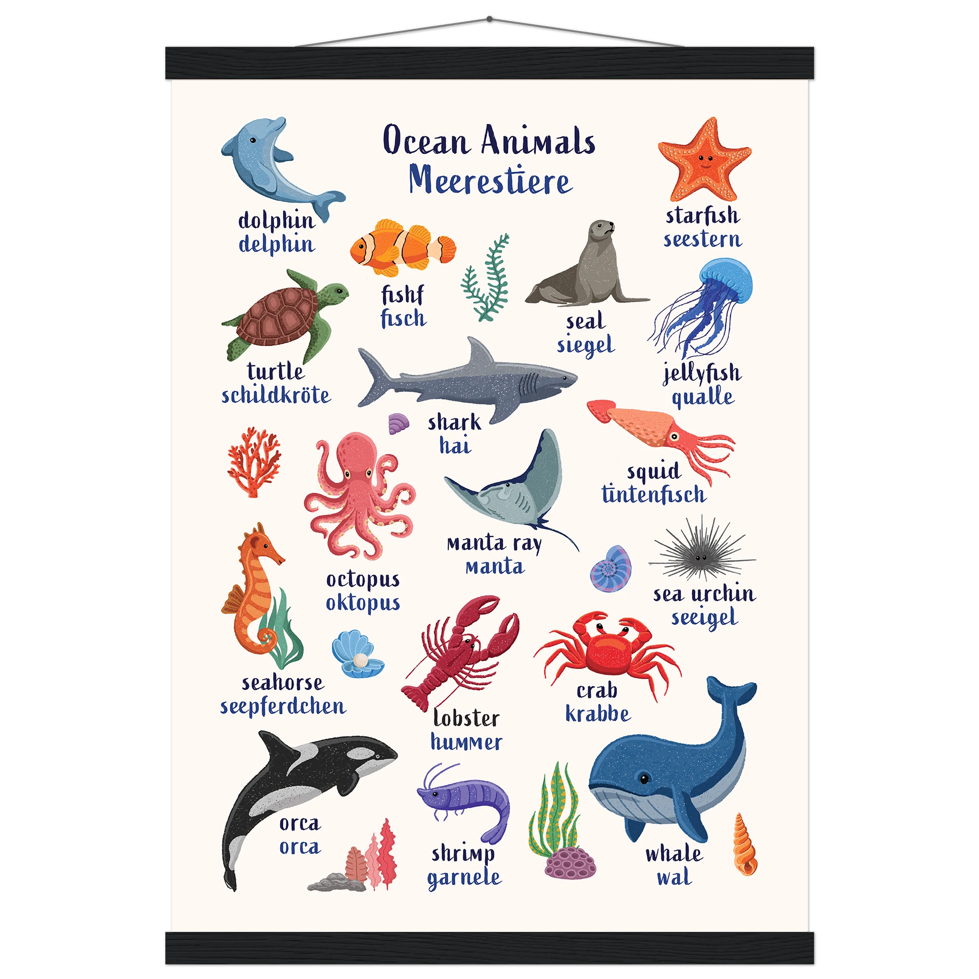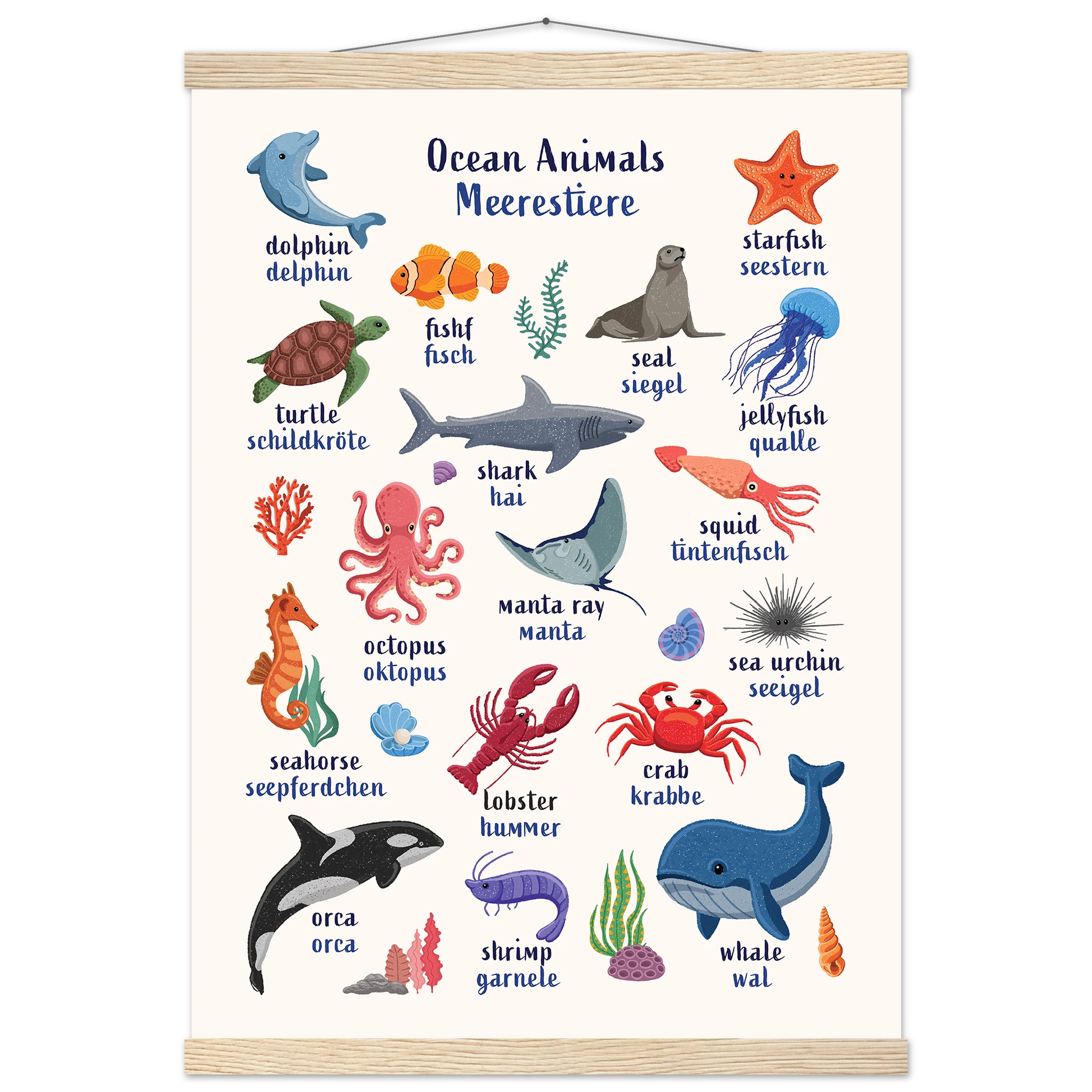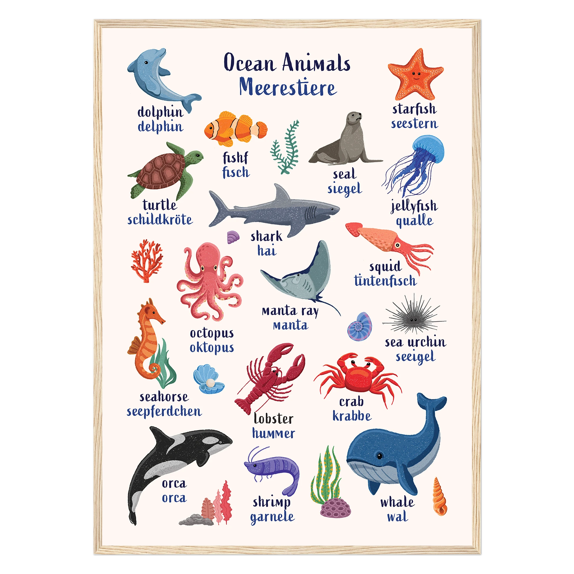 Encourage bilingual learning with this beautifully illustrated Ocean Animals Bilingual Poster for Kids. Designed to support early language learning, each ocean creature is labeled with its name in both English and German — making it easy and fun for toddlers and children (and parents!) to learn new vocabulary together.