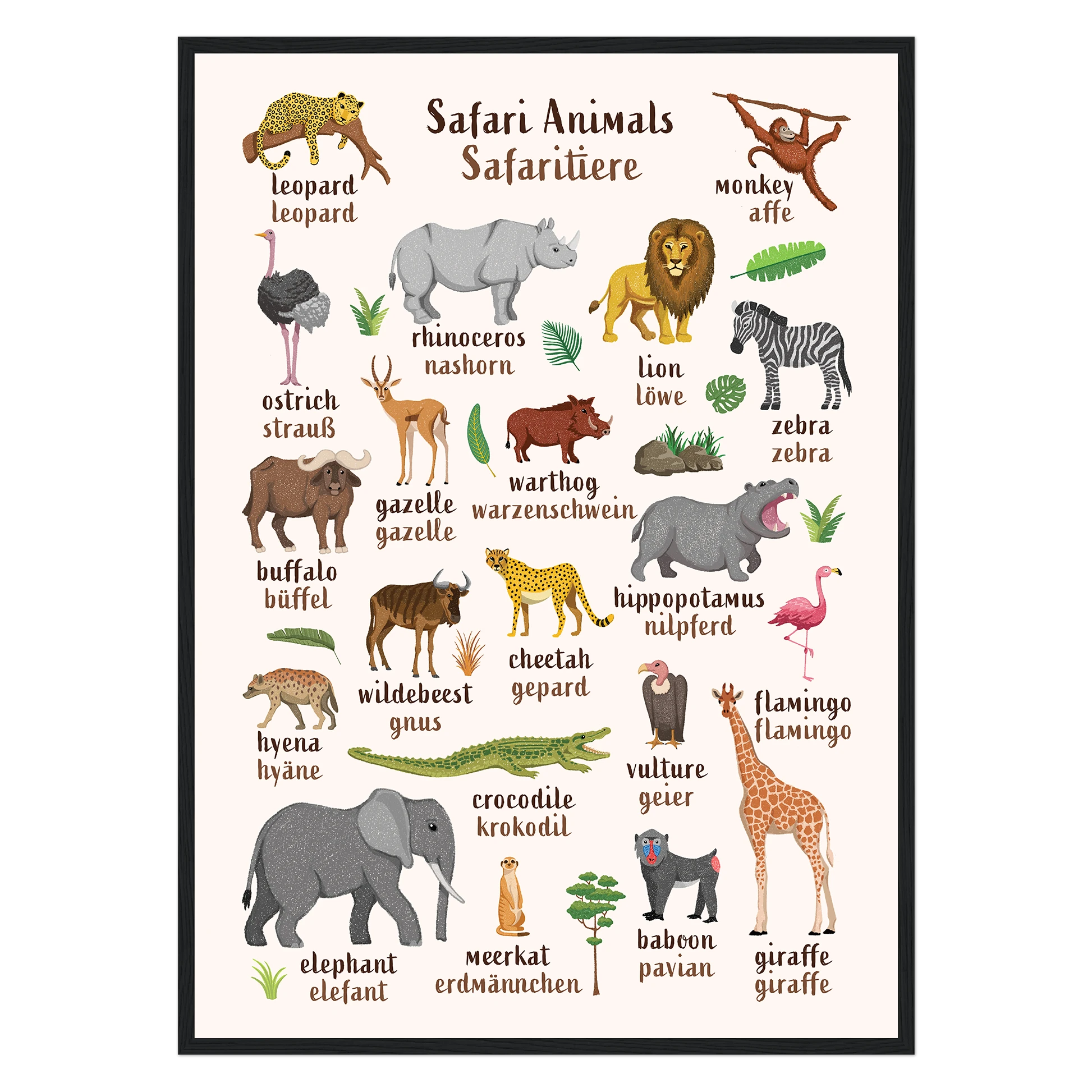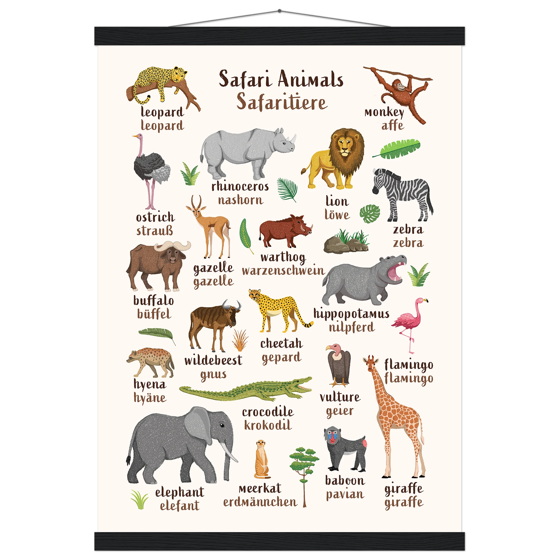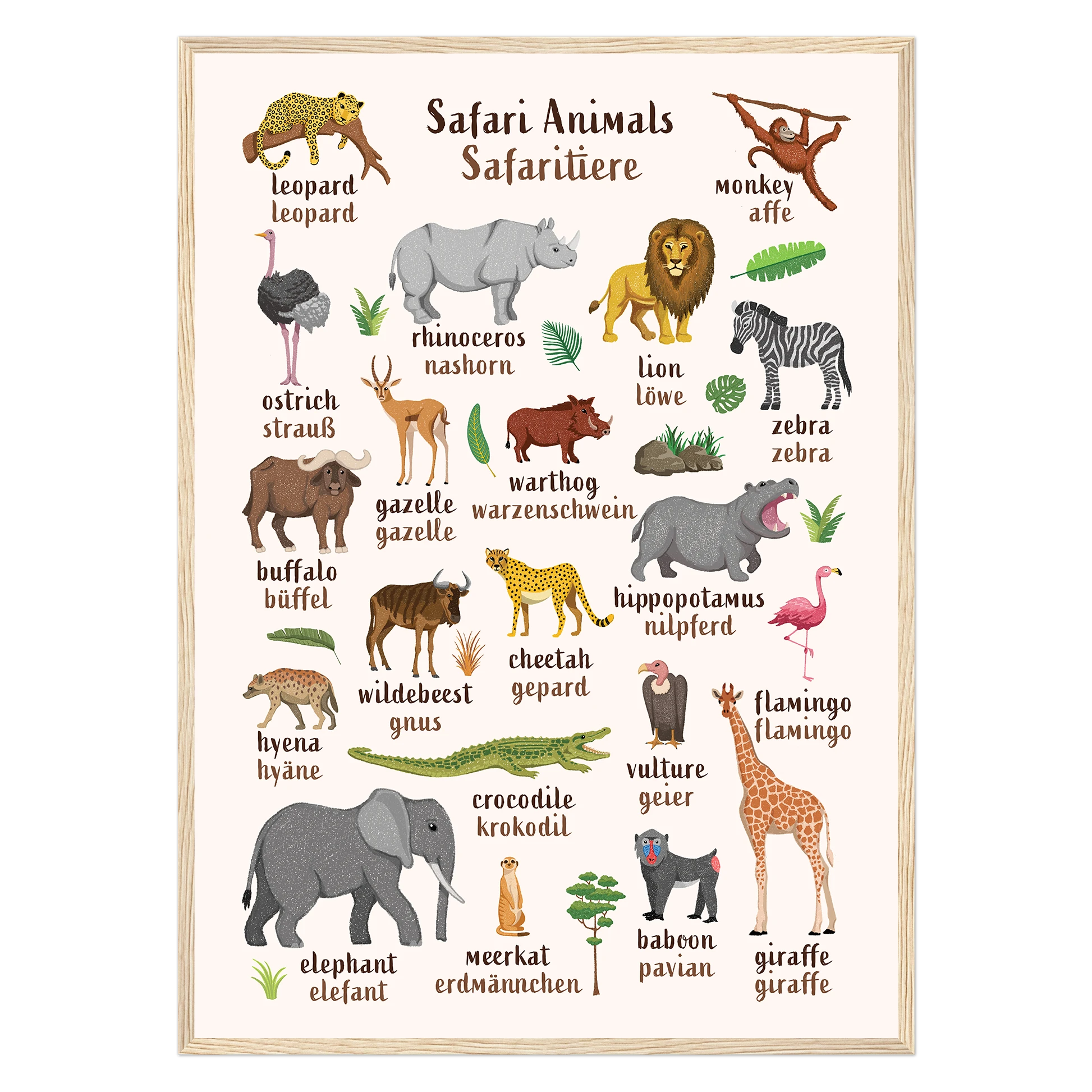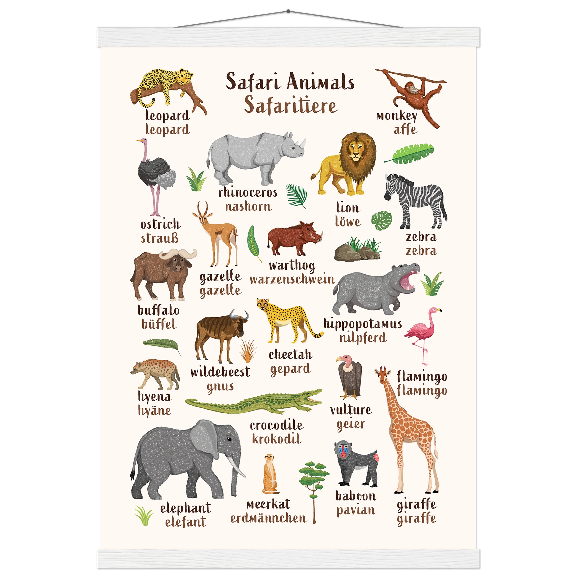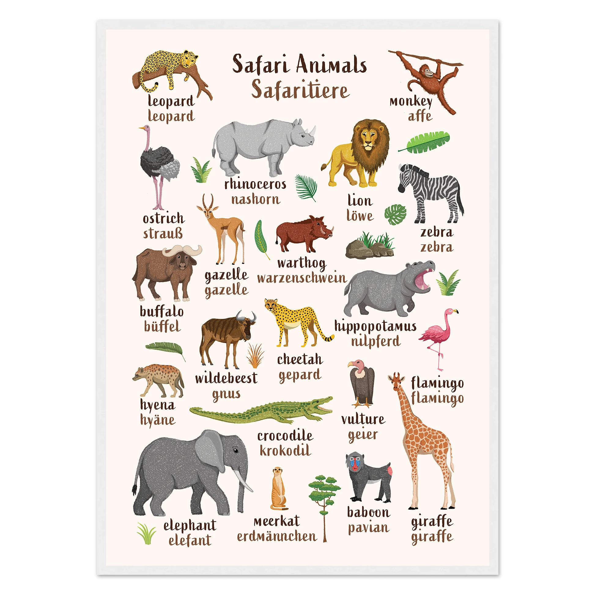 Encourage bilingual learning with this beautifully illustrated Safari Animals Bilingual Poster for Kids. Designed to support early language learning, each safari character is labeled with its name in both English and German — making it easy and fun for toddlers and children (and parents!) to learn new vocabulary together.