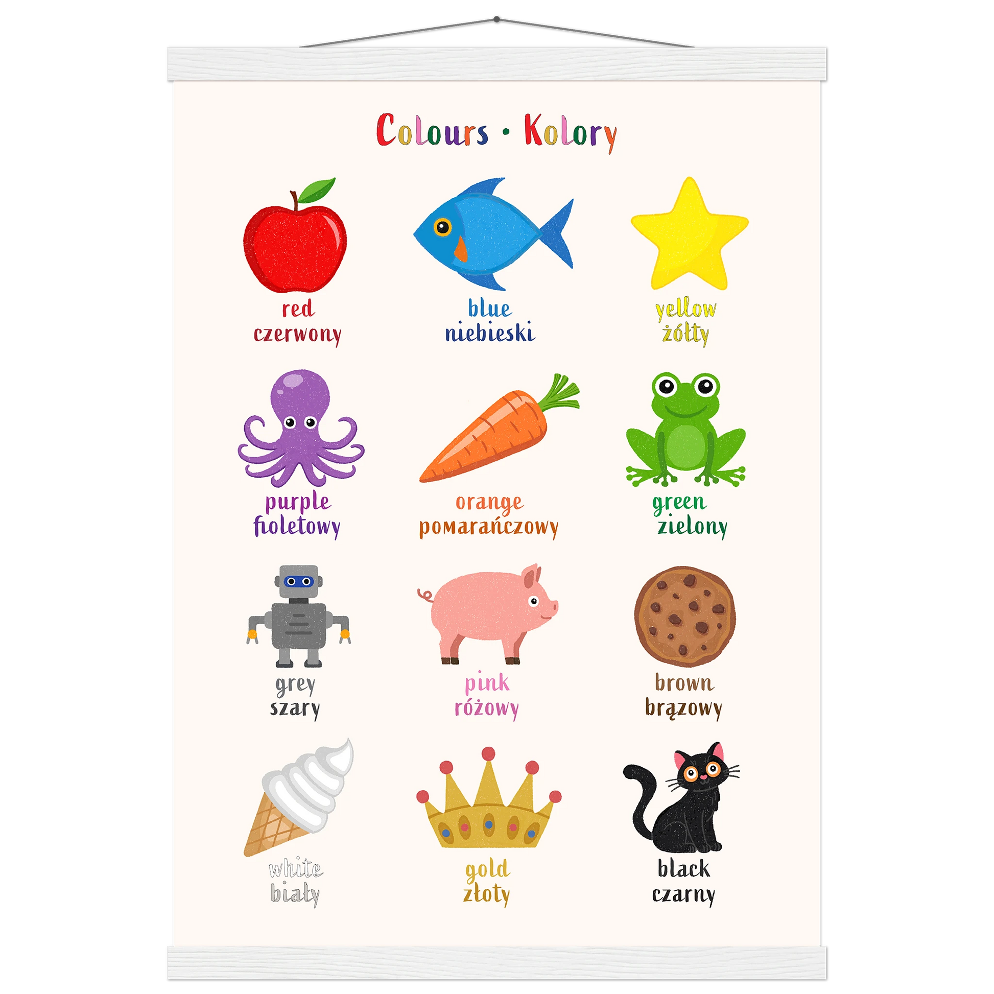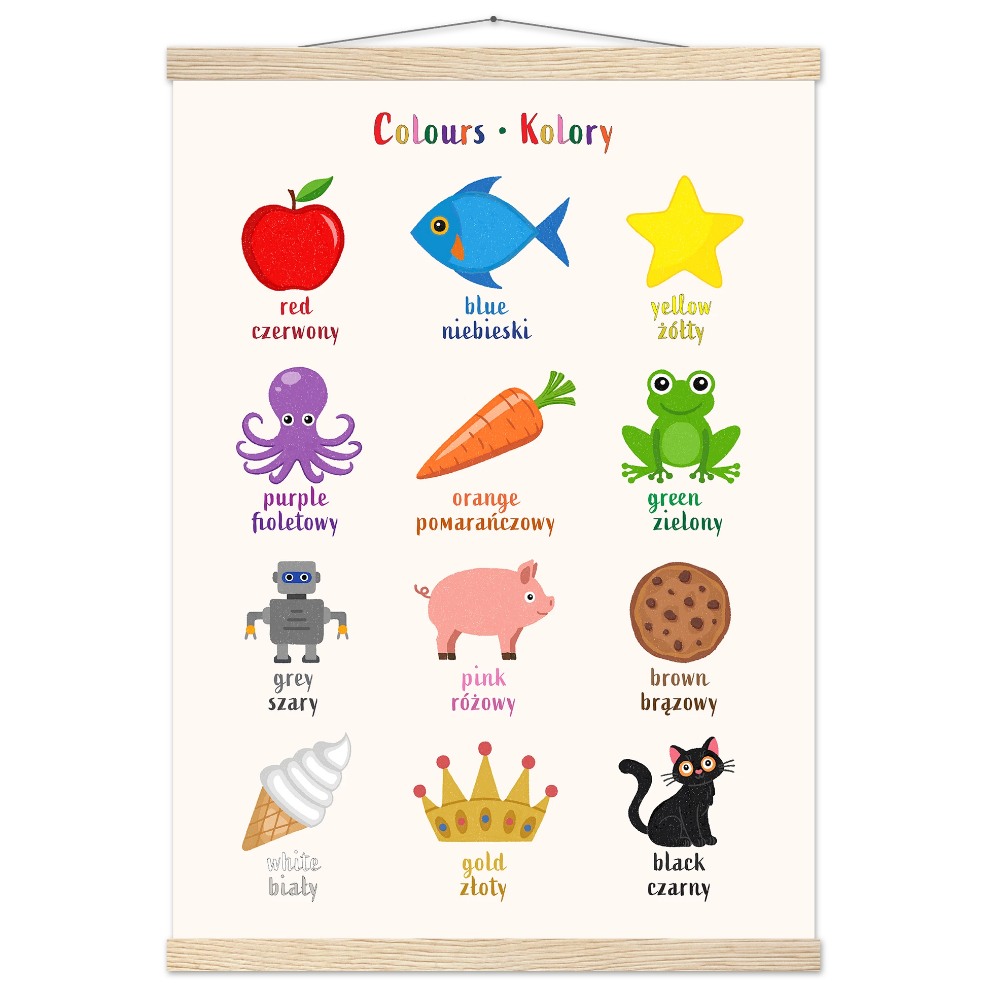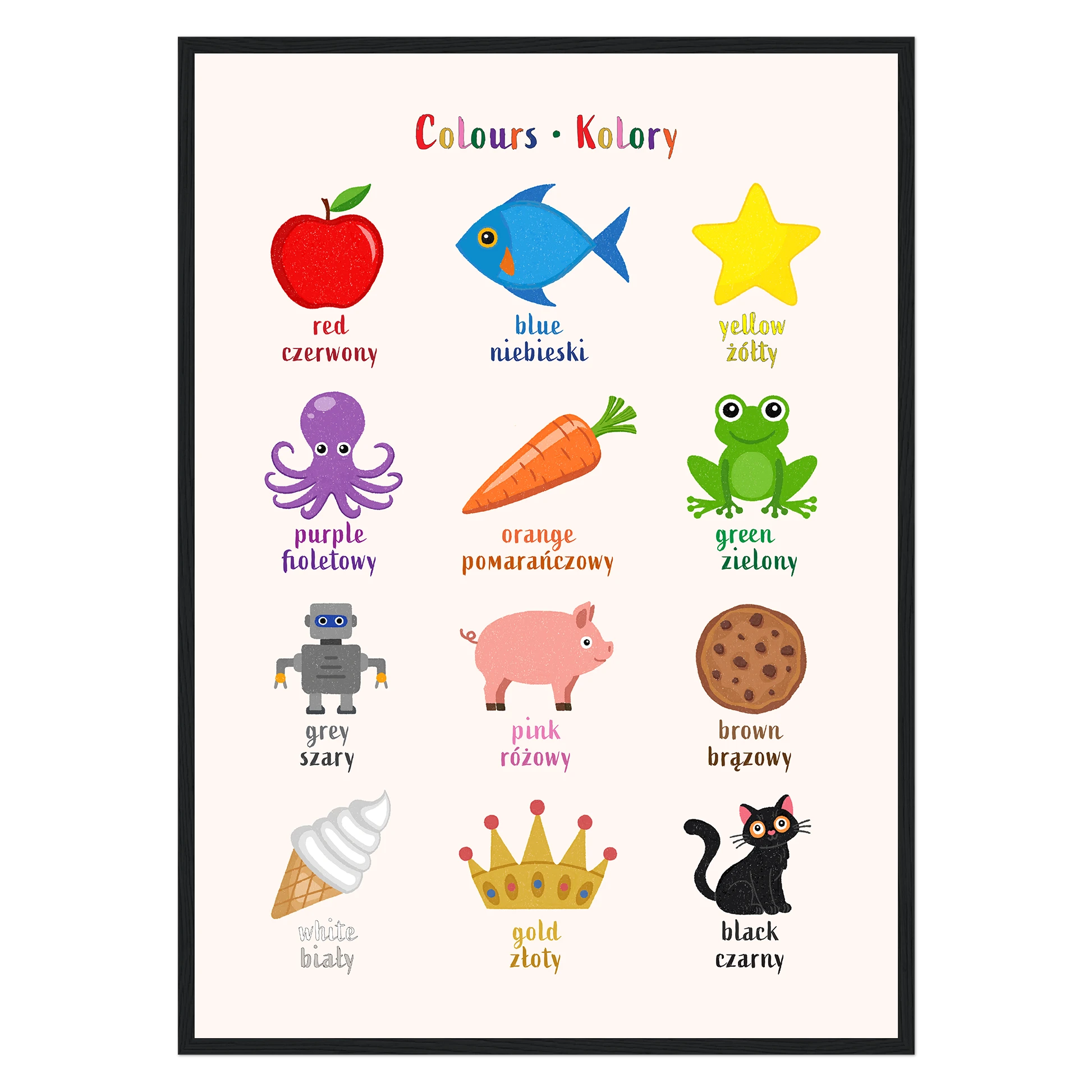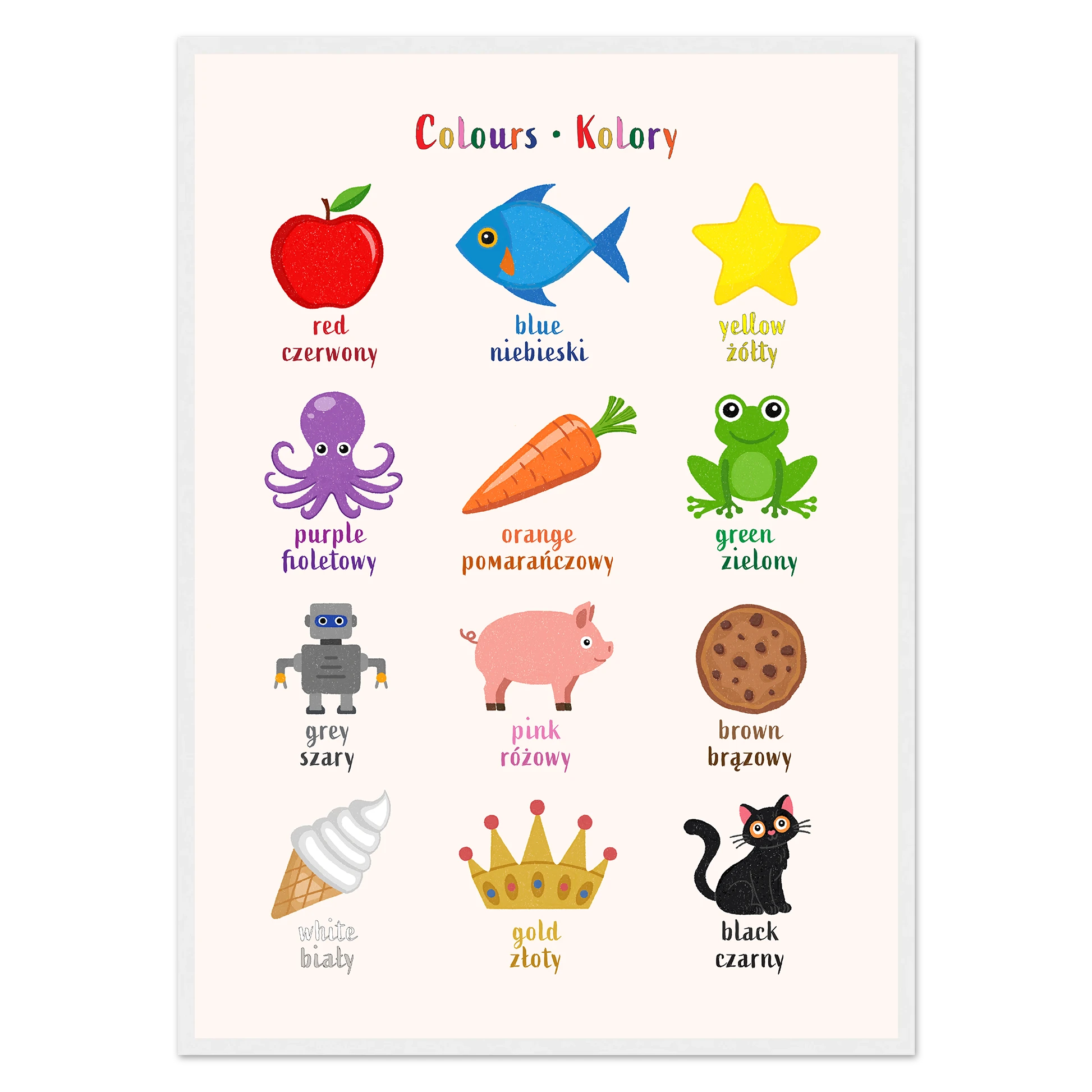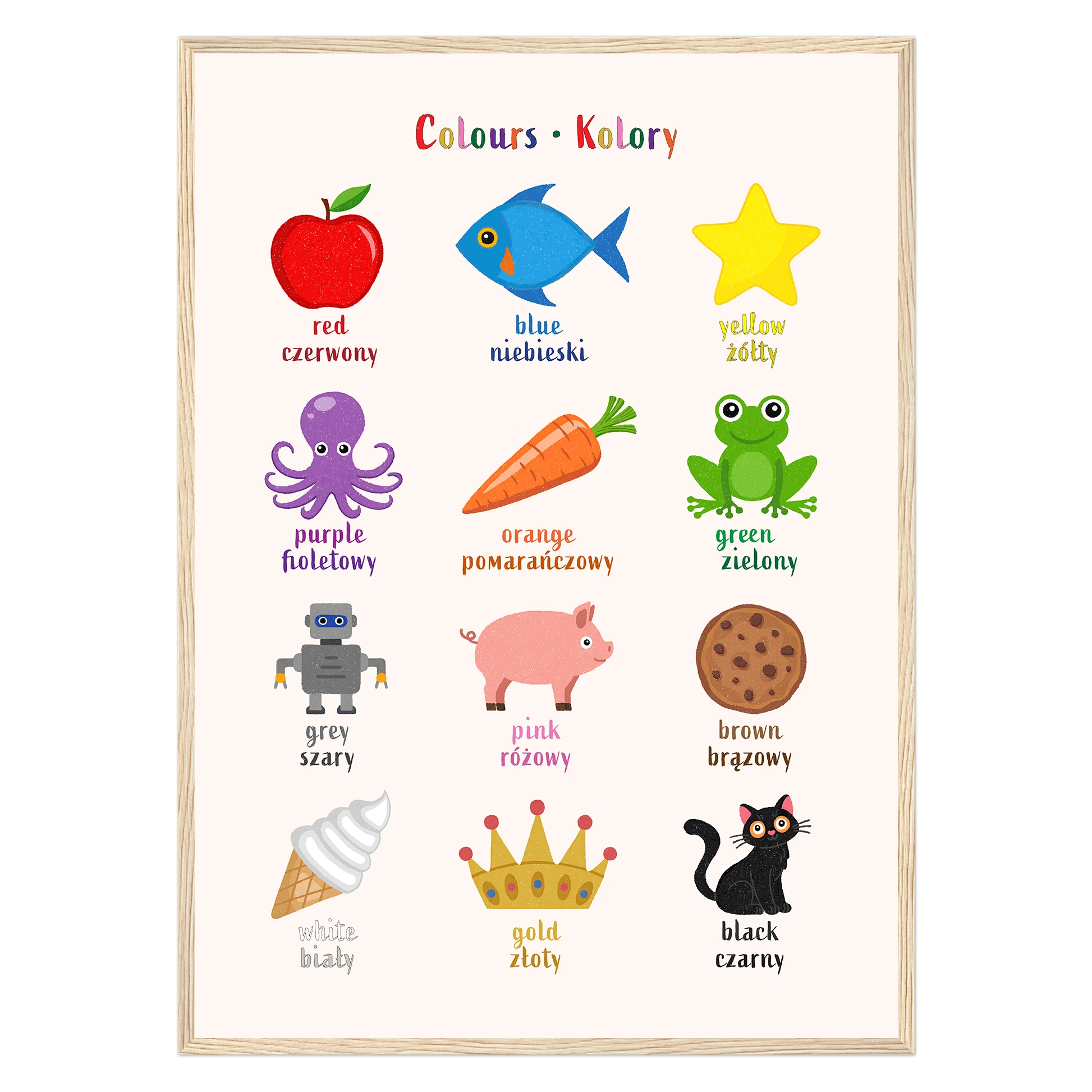 Encourage bilingual learning with this beautifully illustrated poster of colours for kids. Designed to support early language learning, each object is a specific colour labeled with its name in both English and Polish — making it easy and fun for toddlers and children (and parents!) to learn new vocabulary together.