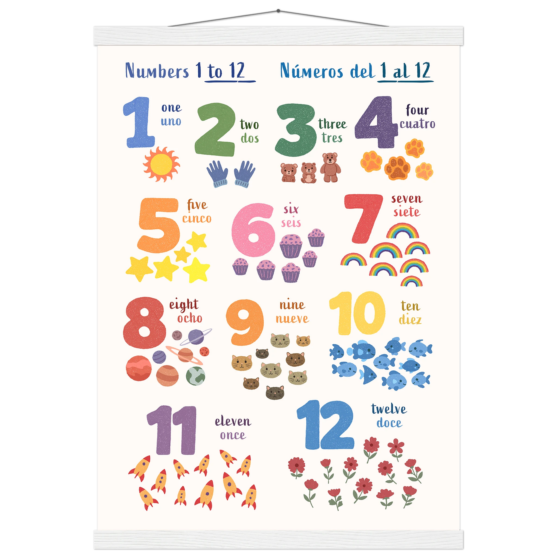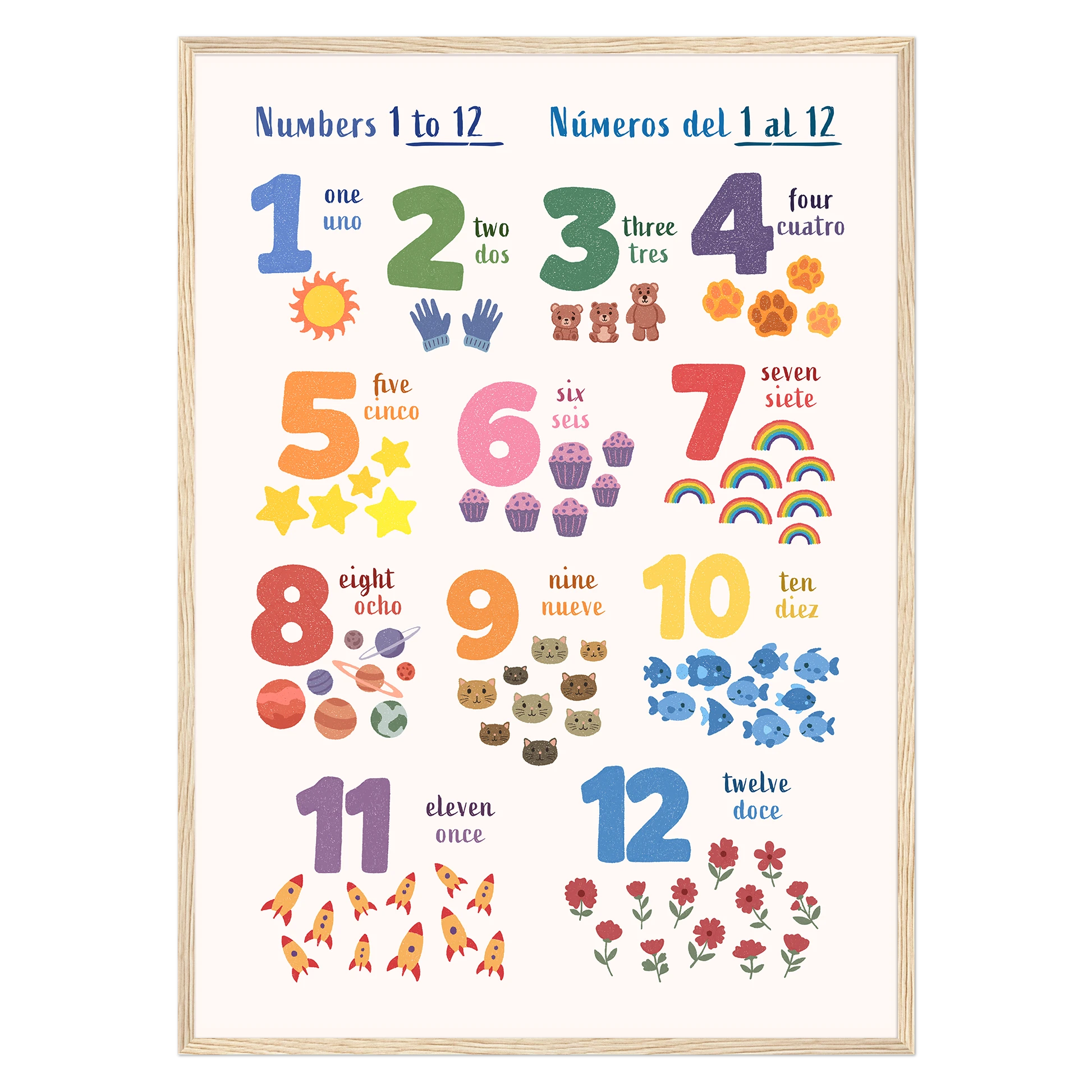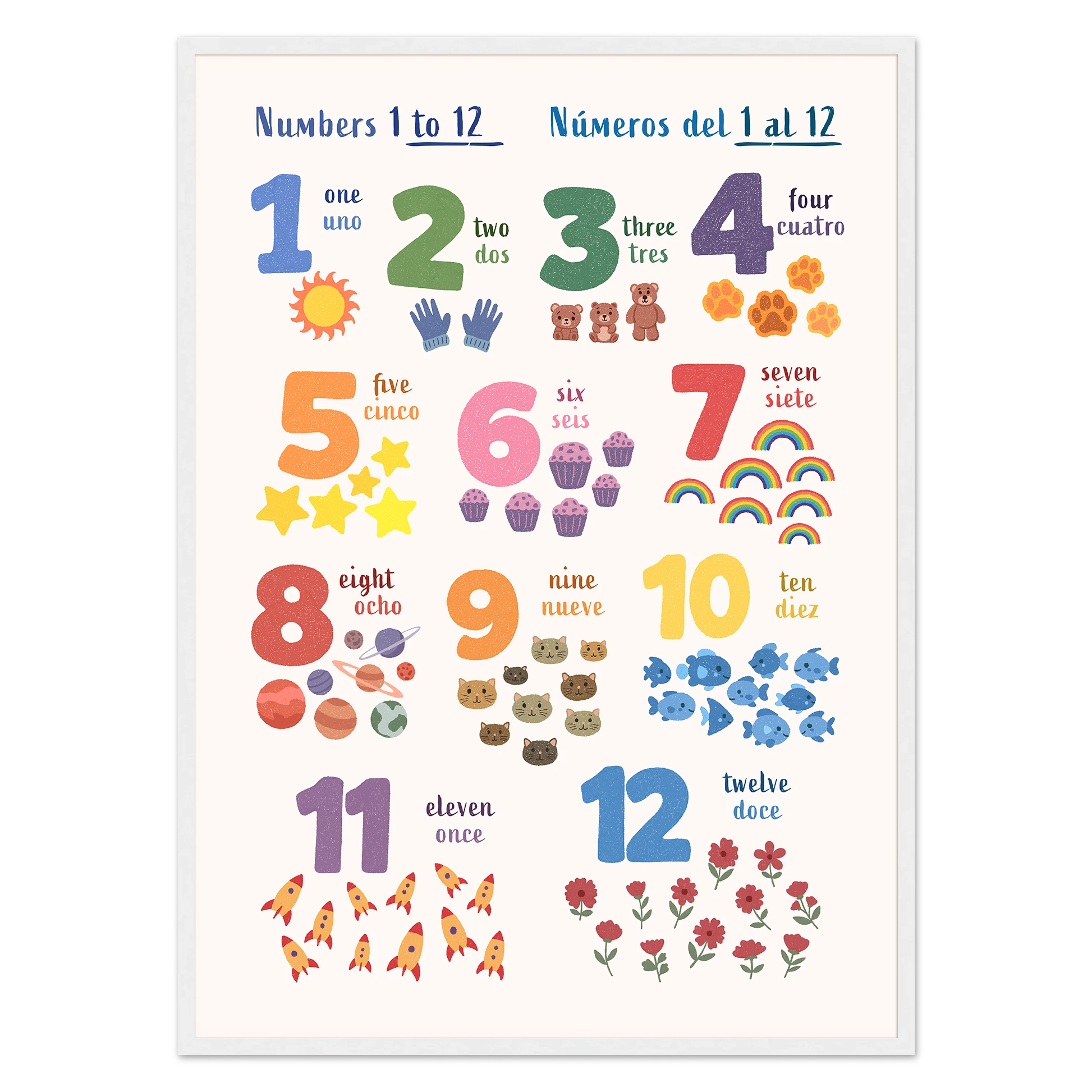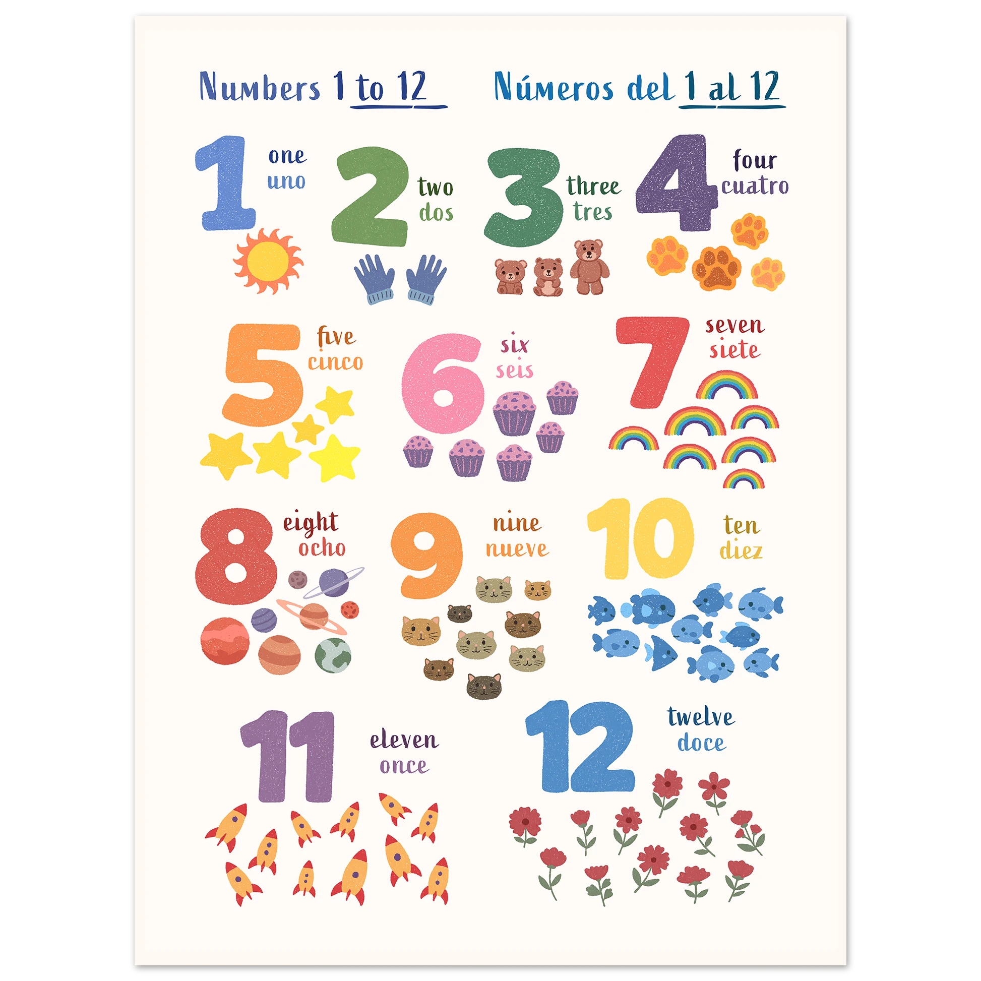Encourage bilingual learning with this beautifully illustrated poster of numbers for kids. Designed to support early language learning, each number alongside matching illustrations is paired with its name in both English and Spanish — making it easy and fun for toddlers and children (and parents!) to learn new vocabulary together.