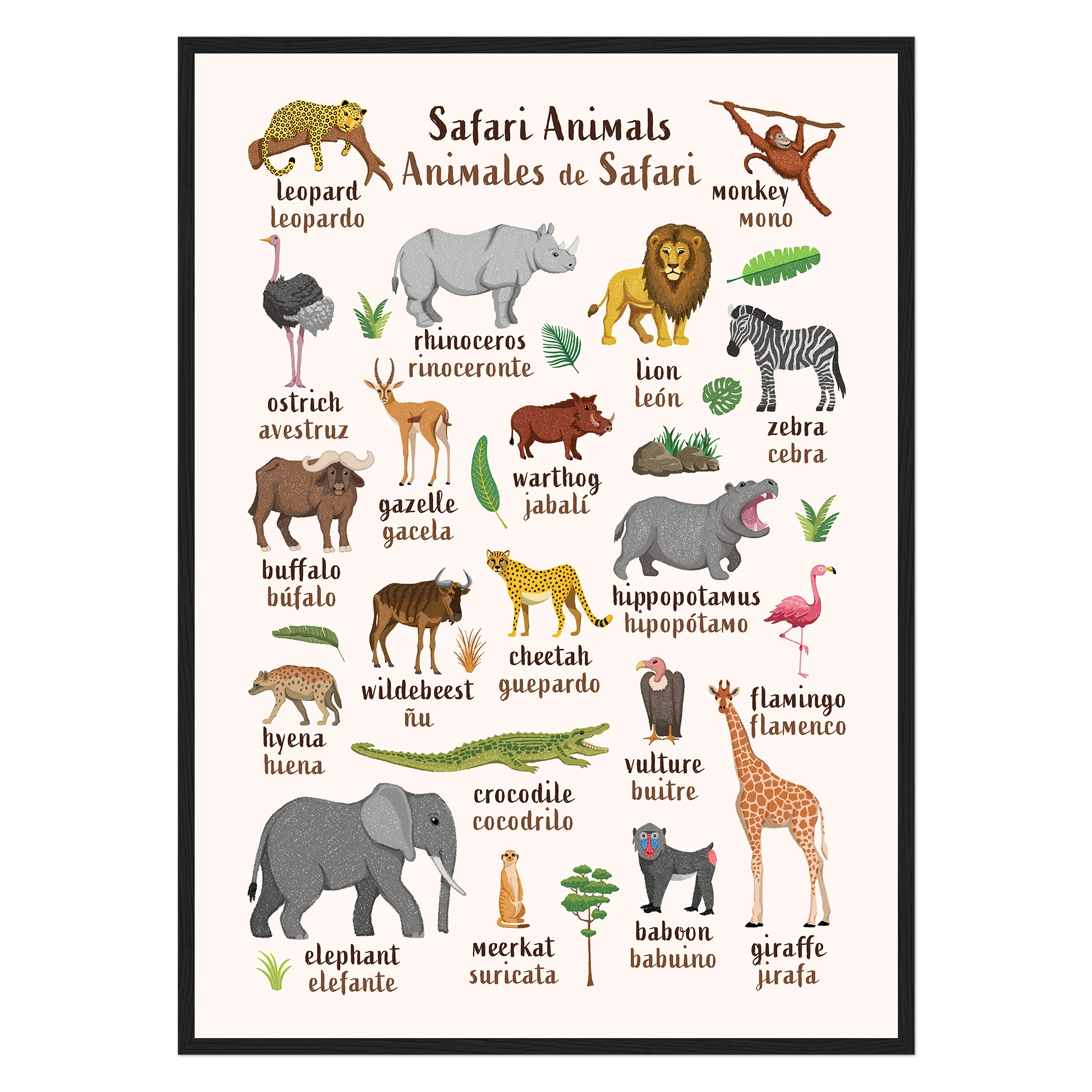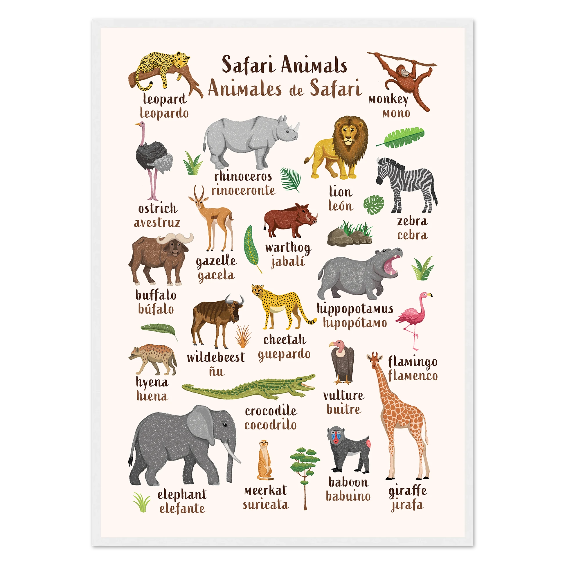 Perfect for nurseries, playrooms, and classrooms, this educational print brings the excitement of the safari into language learning in a fun and meaningful way. A beautiful and practical tool to introduce two languages through everyday words.