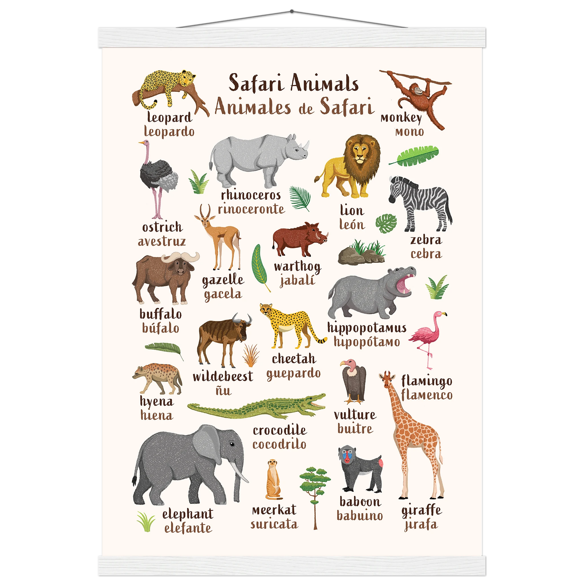 Encourage bilingual learning with this beautifully illustrated Safari Animals Bilingual Poster for Kids. Designed to support early language learning, each safari character is labeled with its name in both English and Spanish — making it easy and fun for toddlers and children (and parents!) to learn new vocabulary together.